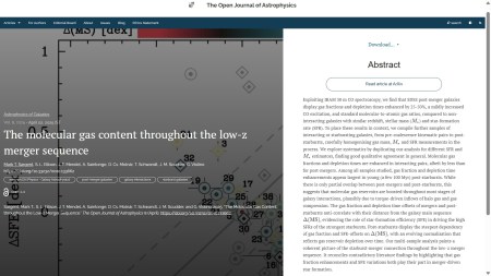 The paper concerned, published on 2nd April 2025, is “The molecular gas content throughout the low-z merger sequence” by Mark T. Sargent (ISSI, Bern), S. L. Ellison (U. Victoria, Canada), J. T. Mendel (ANU), A. Saintonge (UCL), D. Cs. Molnár & T. Schwandt (U. Sussex), J. M. Scudder (Oberlin College, USA) and G. Violino (U. Hertfordshire). It is published in the folder Astrophysics of Galaxies and it discusses the observed properties of molecular gas in post-merger galaxies and interacting pairs and the physical origin of these properties.
