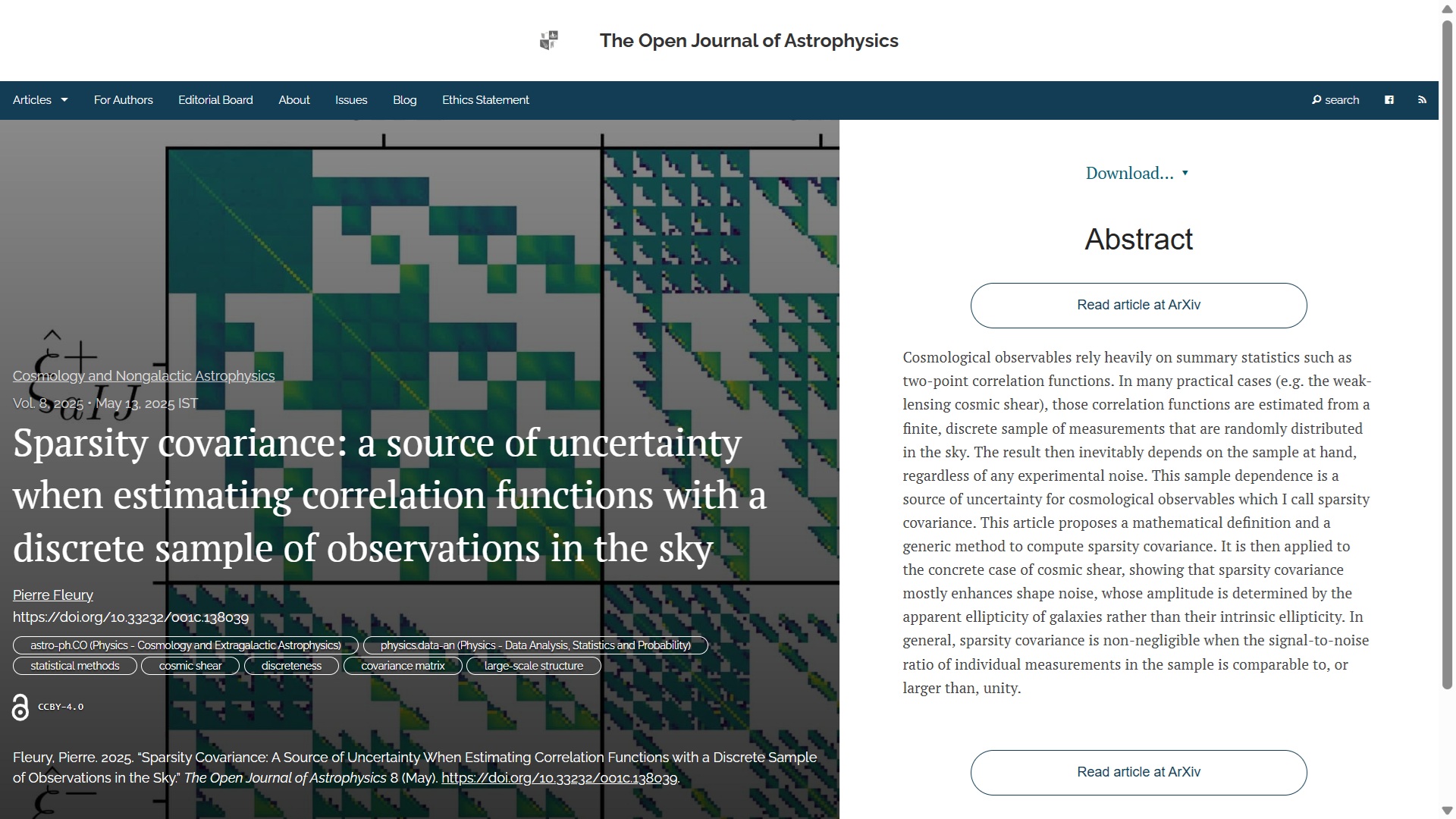Second one up is “Sparsity covariance: a source of uncertainty when estimating correlation functions with a discrete sample of observations in the sky” by Pierre Fleury (U. Montpellier, France). This one was published on Tuesday 13th May 2025 in the folder Cosmology and NonGalactic Astrophysics. This paper presents a discussion of the uncertainty in cosmological observables caused by discrete sampling and a method to compute the covariances resulting from this.