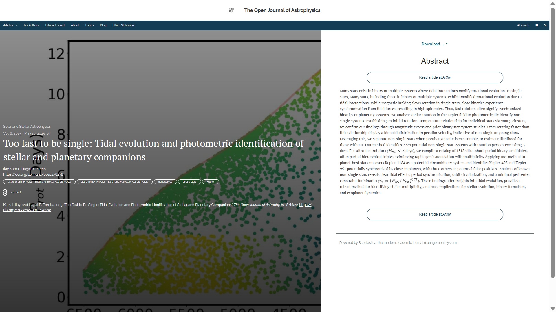 The last paper published this week is “Too fast to be single: Tidal evolution and photometric identification of stellar and planetary companions” by Ilay Kamai and Hagai B. Perets (Technion, Haifa, Israel). This one was published on Friday 16th May 2025 in the folder Solar and Stellar Astrophysics. It presents an analysis of the rotation of stars observed in the Kepler field to identify non-single systems with high spin rates resulting from tidal effects.
