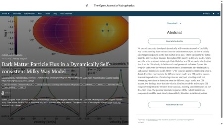 The third paper of the week, published on Wednesday May 14th 2025, is “Dark Matter Particle Flux in a Dynamically Self-consistent Milky Way Model” by Lucijana Stanic, Mark Eberlein, Stanislav Linchakovskyy, Christopher Magnoli, Maryna Mesiura, Luca Morf, Prasenjit Saha (University of Zurich, Switzerland) and Eugene Vasiliev (University of Surrey, UK). This one presents a study of the behaviour of dark matter in an anisotropic model for the Milky Way halo with implications for particle detection rates. It is in the folder Astrophysics of Galaxies.