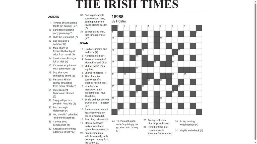 When I first arrived here almost eight years ago I had a look at the crosswords in the Irish Times. I had a go at the cryptic puzzle – called Crosaire – but didn’t find it particularly challenging (and there’s no prize competition) so never got into the habit of doing it. It’s about the same level of difficulty as Everyman, in my opinion, which I used to do mainly to limber up for Azed. I buy the Weekend Edition on paper and have an online subscription, but rarely look at the crossword.
