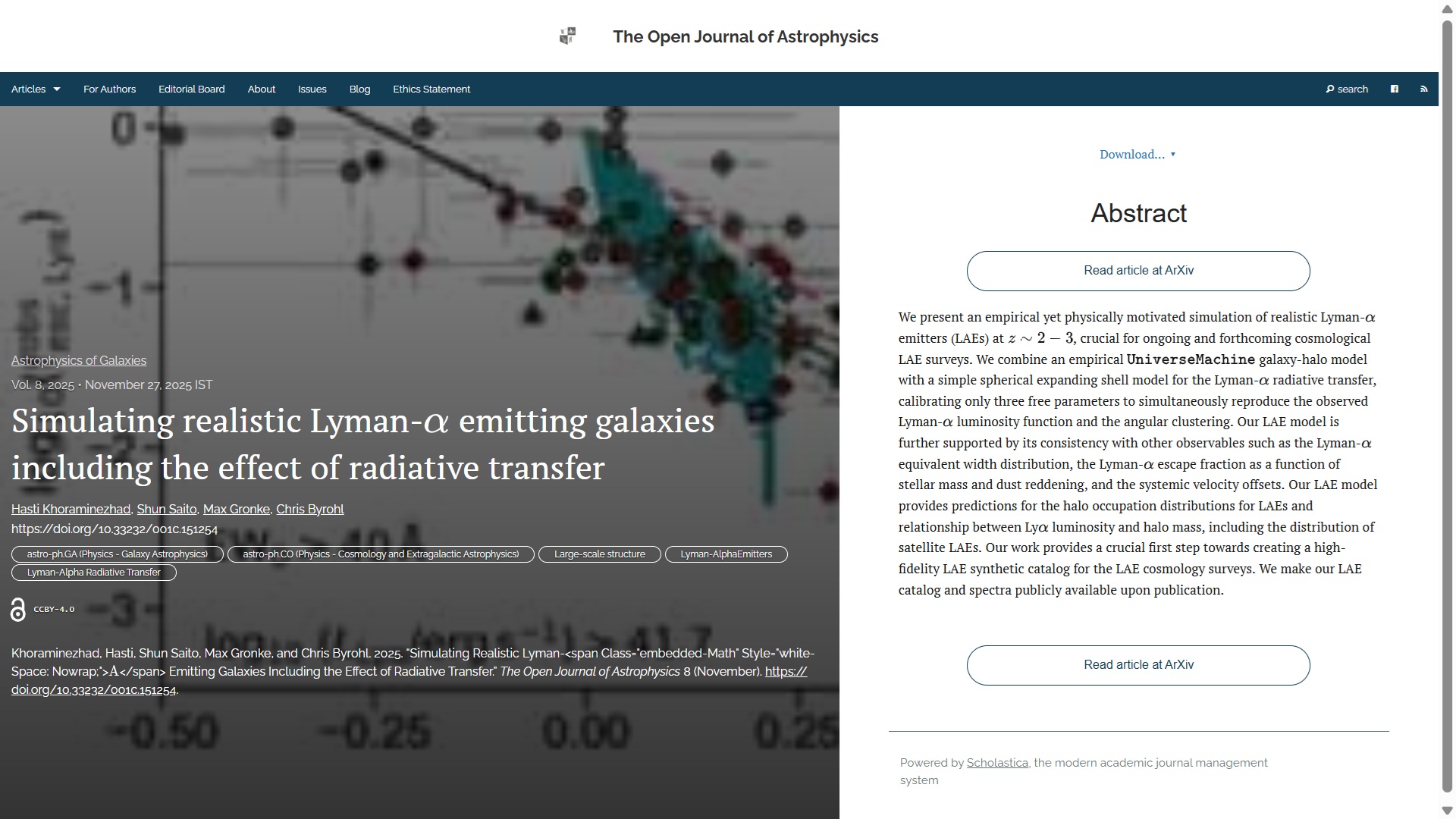 New Publication at the Open Journal of Astrophysics: "Simulating realistic Lyman-alpha emitting galaxies including the effect of radiative transfer" by Hasti Khoraminezhad & Shun Saito (Missouri Institute of Science & Technology, USA), Max Gronke (U. Heidelberg, Germany) and Chris Byrohl (MPA Garching, Germany)