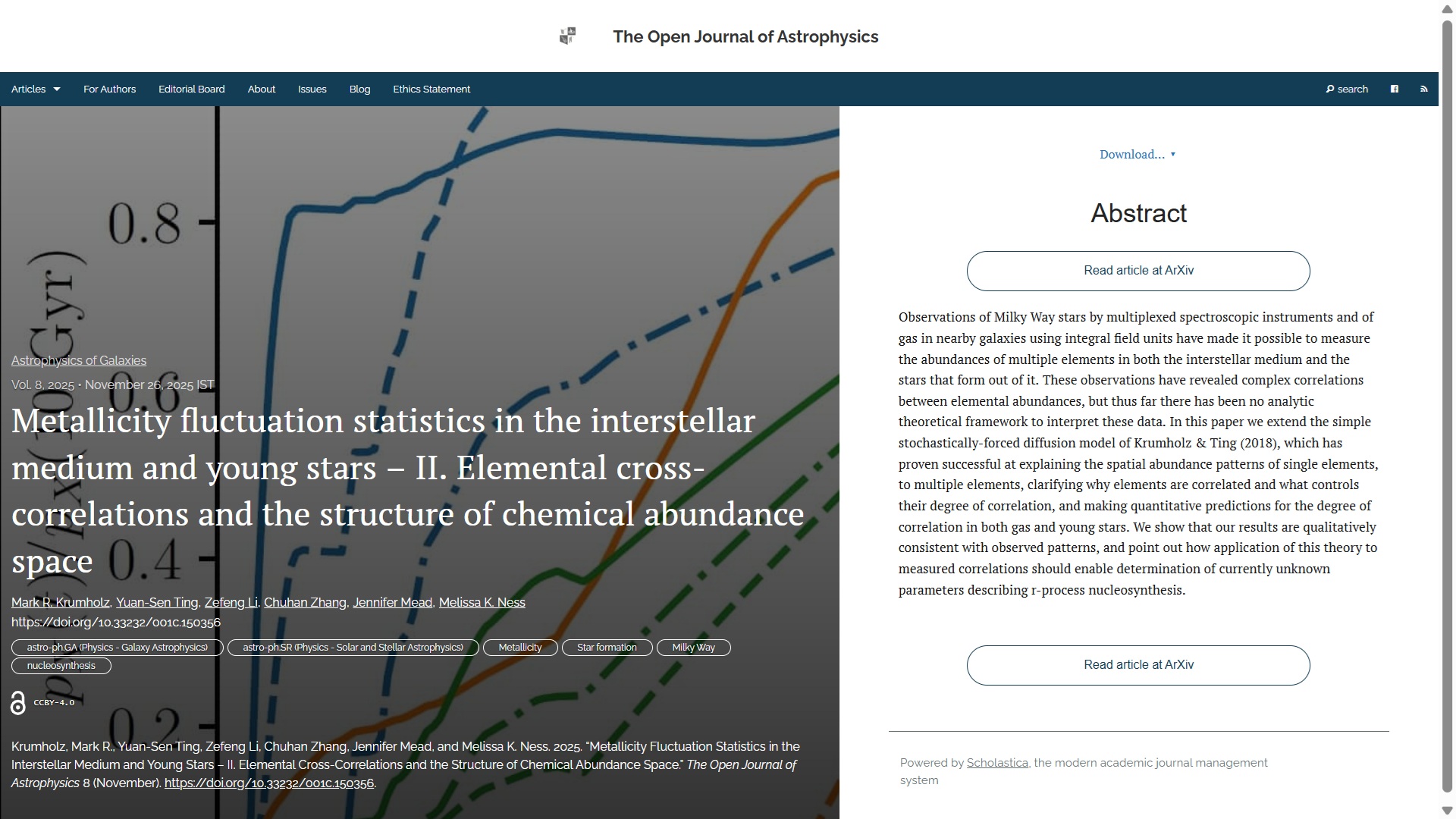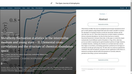 New Publication at the Open Journal of Astrophysics: "Metallicity fluctuation statistics in the interstellar medium and young stars – II. Elemental cross-correlations and the structure of chemical abundance space" by Mark R. Krumholz (ANU, Australia), Yuan-Sen Ting (Ohio State U., USA), Zefeng Li (Durham U., UK), Chuhan Zhang (ANU), Jennifer Mead (Columbia U., USA) and Melissa K. Ness (ANU)