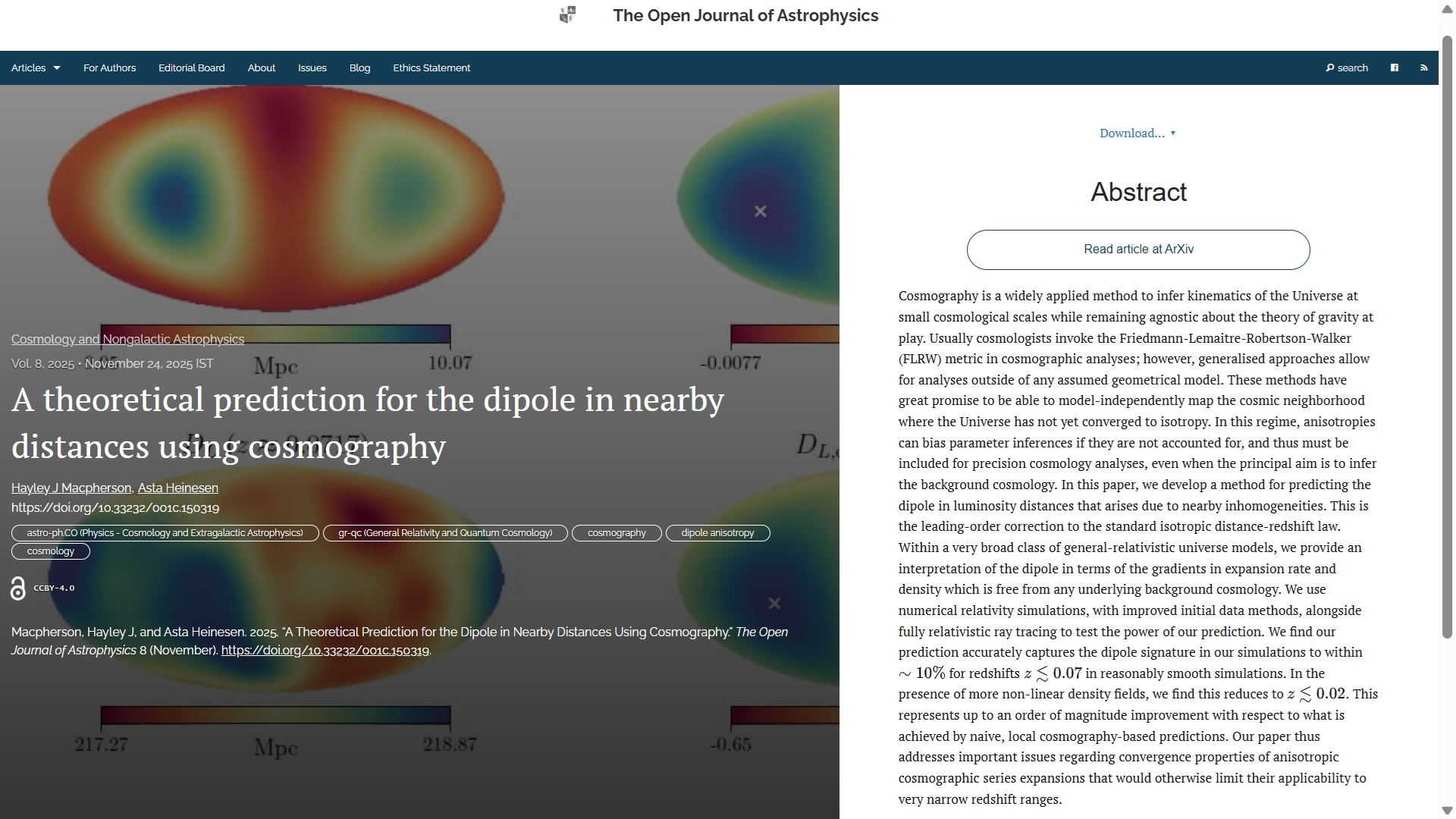 New Publication at the Open Journal of Astrophysics: "A theoretical prediction for the dipole in nearby distances using cosmography" by Hayley J Macpherson (U. Chicago, USA) and Asta Heinesen (Niels Bohr Institute, Denmark)