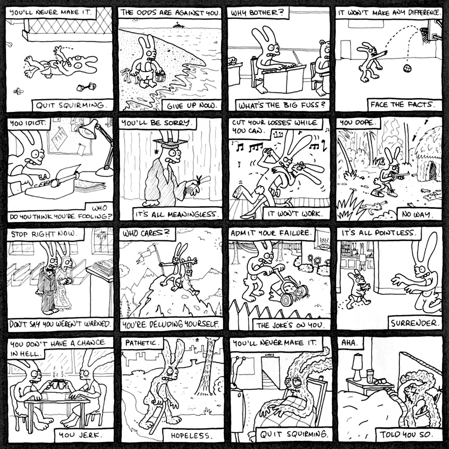 The cartoon reminds me of this wonderful early work of Matt Groening: https://www.roe.ac.uk/~jap/life_in_hell.jpg
