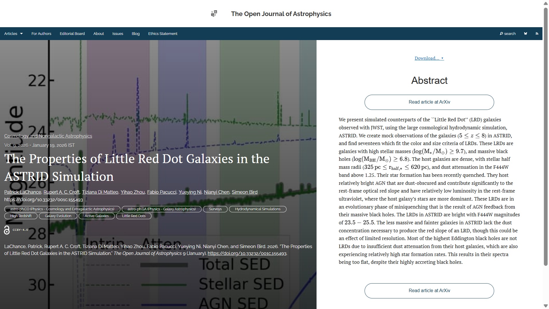 The first paper to report this week is “The Properties of Little Red Dot Galaxies in the ASTRID Simulation” by Patrick LaChance, Rupert A. C. Croft, Tiziana Di Matteo & Yihao Zhou (Carnegie Mellon U.), Fabio Pacucci (Harvard-Smithsonian CfA), Yueying Ni (U. Michigan Ann Arbor), Nianyi Chen (Princeton U.) and Simeon Bird (UC Riverside), all based in the USA. This paper was published on Monday 19th January 2026 in the folder Cosmology and Nongalactic Astrophysics; the study analyses mock observations of “Little Red Dot” galaxies created from the ASTRID simulation, having high stellar masses and containing massive black holes; not all features match real observations.