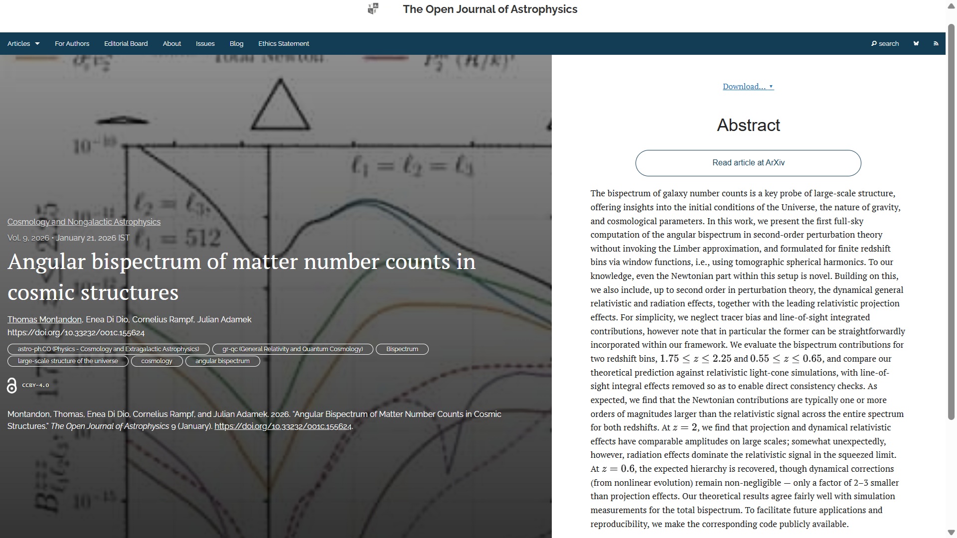 The second paper is “Angular bispectrum of matter number counts in cosmic structures” by Thomas Montandon (U. Montpellier, France), Enea Di Dio (U. Genève, Switzerland), Cornelius Rampf (Ruđer Bošković Institute, Croatia) and Julian Adamek (U. Zürich, Switzerland). This was published on Wednesday January 21st, also in the folder Cosmology and Nongalactic Astrophysics. This paper presents thee first full-sky computation of the angular bispectrum in second-order perturbation theory, offering insights into the Universe’s initial conditions, gravity, and cosmological parameters. The results align well with simulations.