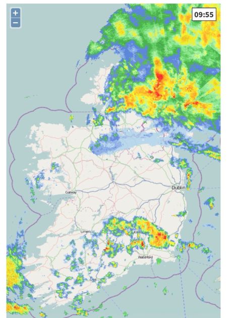 The main mass of raincloud to the North had passed over us by then, and the small but intense strip off the Louth/Dublin coast missed Maynooth entirely. You can see a big gap. Rain was heading towards us from the South, and did reach us in the afternoon, though it wasn’t particularly severe. It remained reasonably warm throughout the day, though it is much colder now (I’m writing this at about 7.30pm).