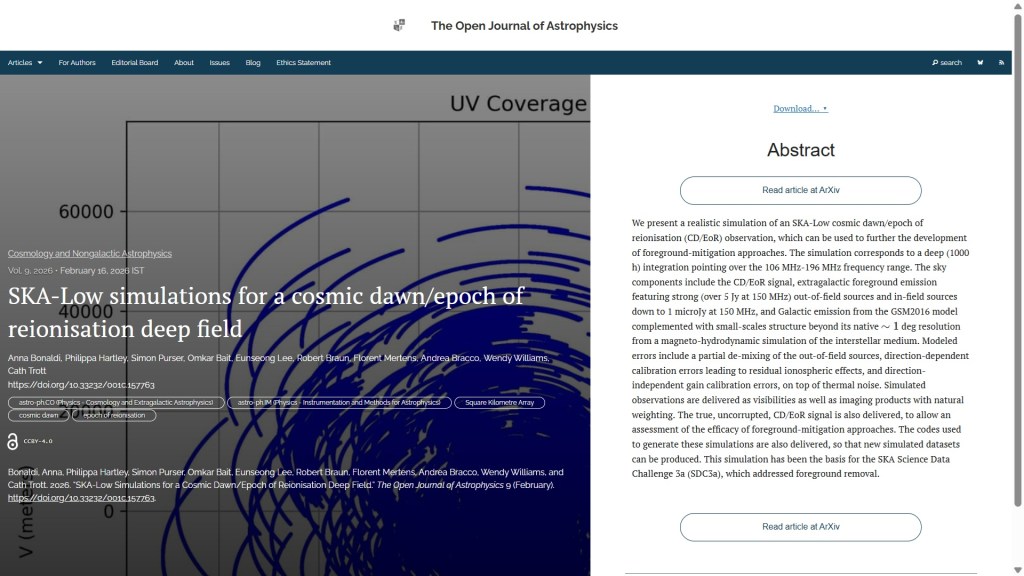 New Publication at the Open Journal of Astrophysics: "SKA-Low simulations for a cosmic dawn/epoch of reionisation deep field" by Anna Bonaldi, Philippa Hartley, Simon Purser & Omkar Bait (SKAO, UK), Eunseong Lee (U. Manchester, UK), Robert Braun (SKAO), Florent Mertens (Sorbonne Université, France), Andrea Bracco (Osservatorio Astrofisico di Arcetri, IT), Wendy Williams (SKAO) and Cath Trott (Curtin U., Australia)