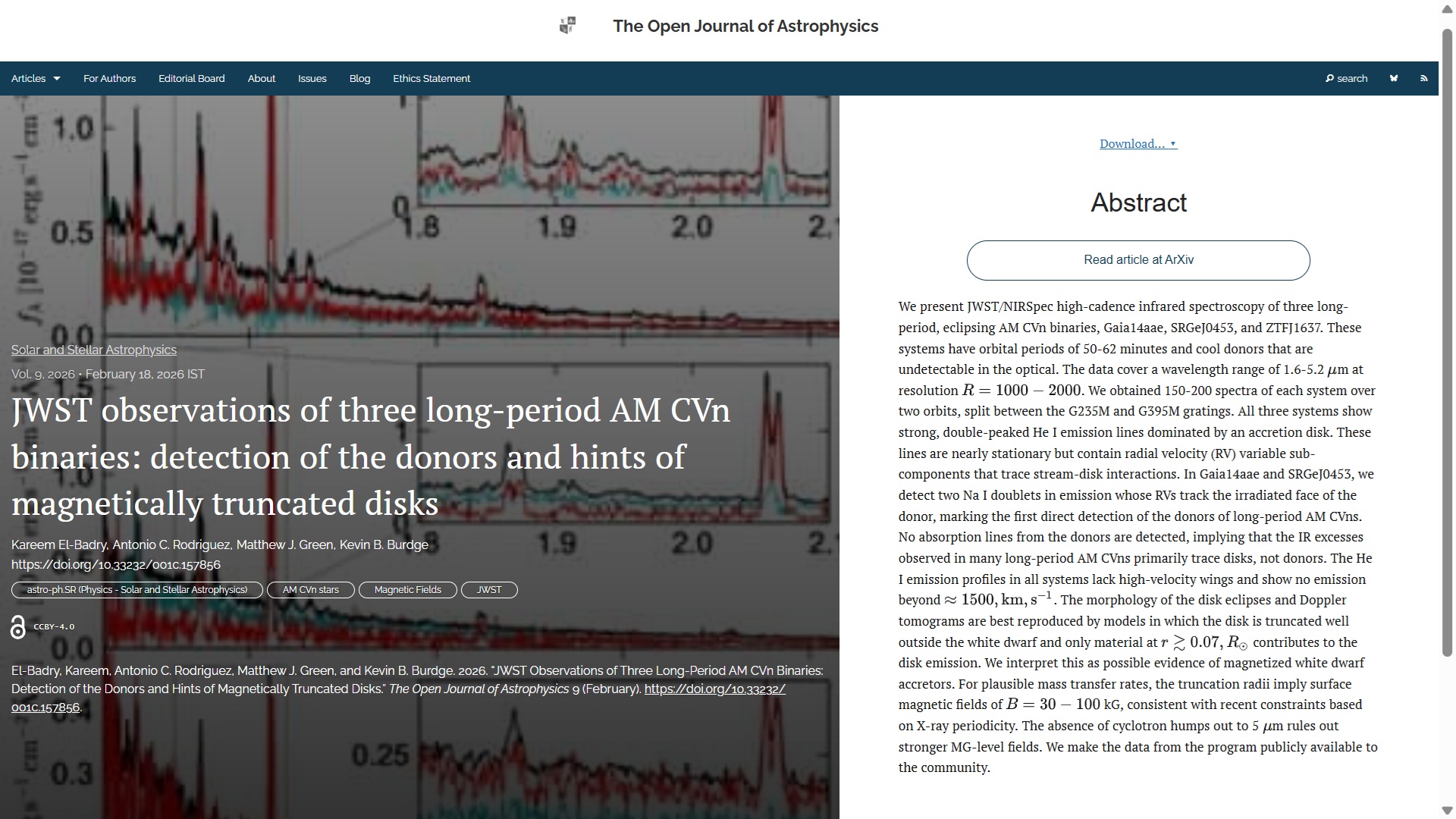 New Publication at the Open Journal of Astrophysics: "JWST observations of three long-period AM CVn binaries: detection of the donors and hints of magnetically truncated disks" by Kareem El-Badry (Caltech), Antonio C. Rodriguez (CfA Harvard), Matthew J. Green (U. Oklahoma) & Kevin B. Burdge (MIT); all in USA
