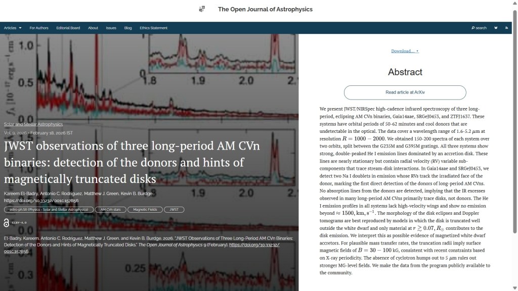 The fifth paper this week, is “JWST observations of three long-period AM CVn binaries: detection of the donors and hints of magnetically truncated disks” by Kareem El-Badry (Caltech), Antonio C. Rodriguez (CfA Harvard), Matthew J. Green (U. Oklahoma) & Kevin B. Burdge (MIT); all based in the USA. The article was published on Thursday 19th February 2026 in the folder Solar and Stellar Astrophysics. The paper describes high-cadence infrared spectroscopy used to analyze three long-period, eclipsing AM CVn (AM Canum Venaticorum) binaries; findings suggest the presence of magnetized white dwarf accretors, with surface magnetic fields of 30-100 kG.