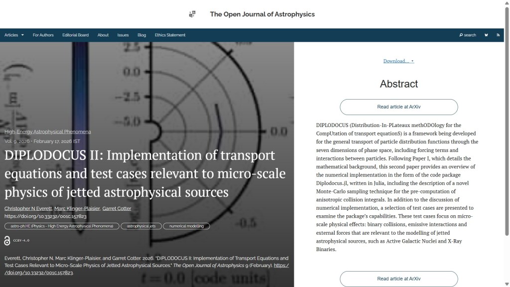 Next, published on Tuesday 17th February in the folder High-Energy Astrophysical Phenomena, is “DIPLODOCUS II: Implementation of transport equations and test cases relevant to micro-scale physics of jetted astrophysical sources” by Christopher N Everett (Oxford U., UK), Marc Klinger-Plaisier (U. Amsterdam, NL) and Garret Cotter (Oxford). This one discusses further applications of DIPLODOCUS, which is a framework developed for particle distribution transport, with its numerical implementation detailed in Diplodocus.jl. It uses a new sampling technique and is tested on micro-scale physical effects. The first paper in the series can be found here.