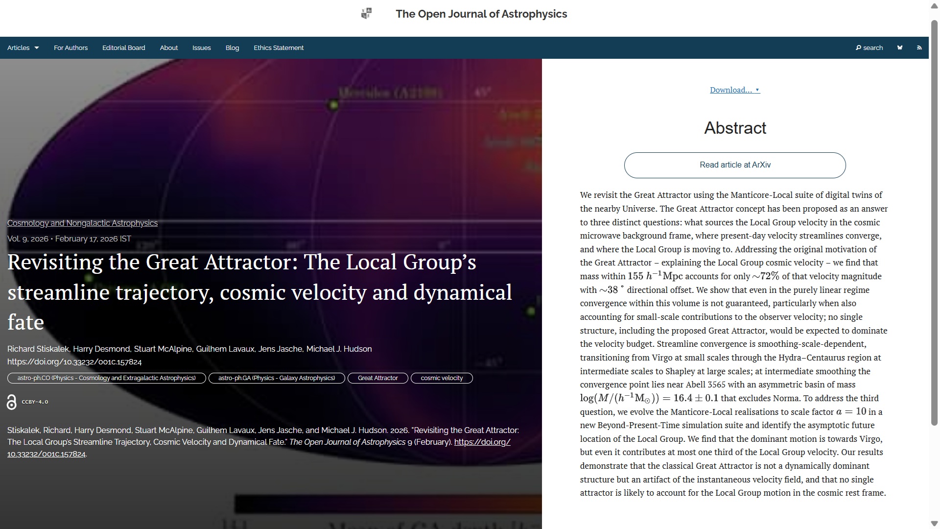 New Publication at the Open Journal of Astrophysics: "Revisiting the Great Attractor: The Local Group’s streamline trajectory, cosmic velocity and dynamical fate" by Richard Stiskalek (Oxford U., UK), Harry Desmond (U. Portsmouth, UK), Stuart McAlpine (Stockholm, SE), Guilhem Lavaux (Sorbonne Université, FR), Jens Jasche (Stockholm) and Michael J. Hudson (U. Waterloo, Canada)