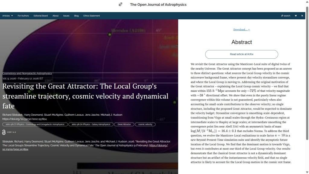 The fourth paper this week, also published on Tuesday 17th February, but in the folder Cosmology and Nongalactic Astrophysics is “Revisiting the Great Attractor: The Local Group’s streamline trajectory, cosmic velocity and dynamical fate” by Richard Stiskalek (Oxford U., UK), Harry Desmond (U. Portsmouth, UK), Stuart McAlpine (Stockholm, SE), Guilhem Lavaux (Sorbonne Université, FR), Jens Jasche (Stockholm) and Michael J. Hudson (U. Waterloo, Canada). This paper revisits the so-called “Great Attractor” concept, finding that it doesn’t dominate the Local Group’s cosmic velocity; multiple structures contribute to the motion, with no single attractor accounting for the flow.