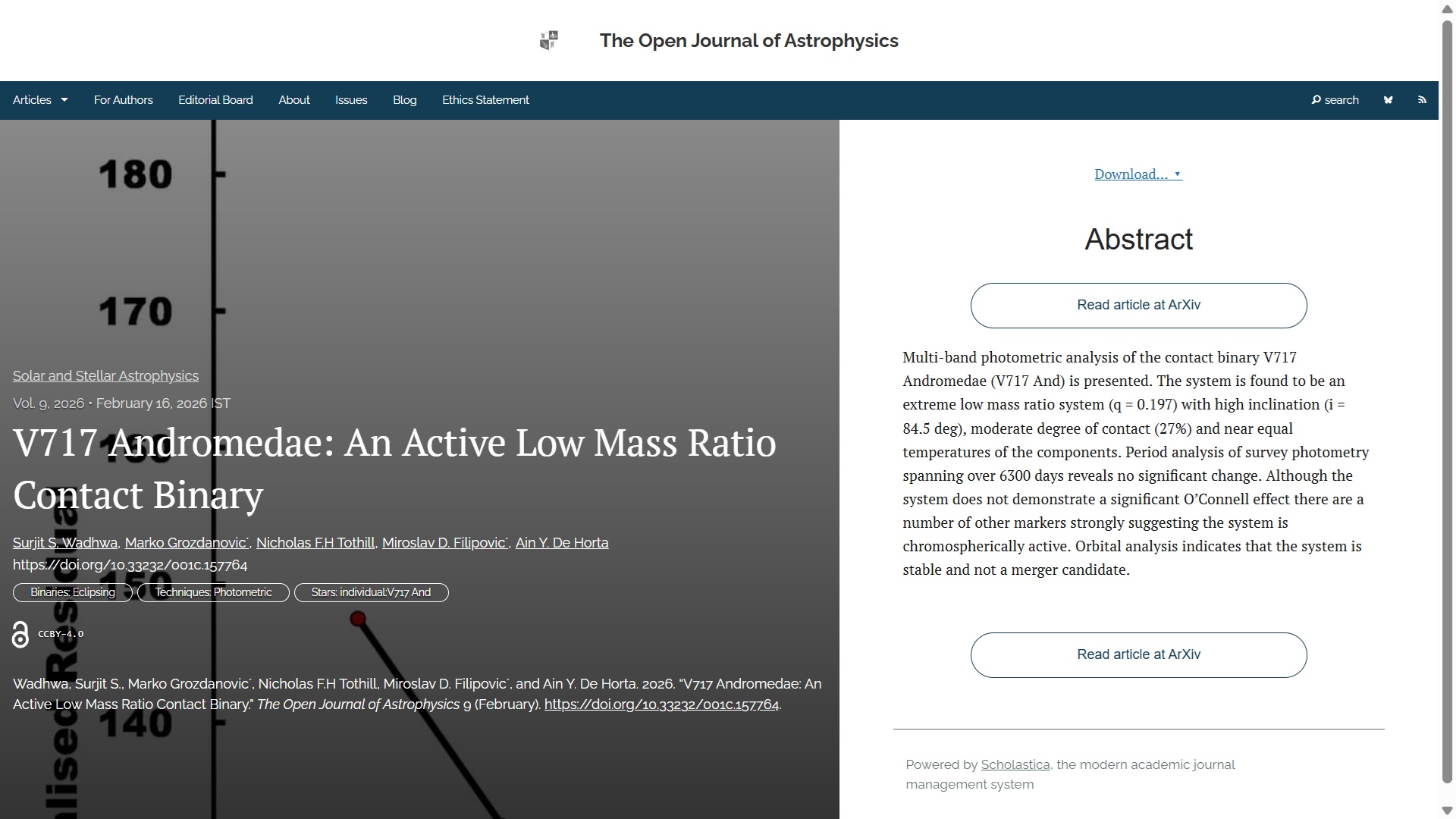 The second paper is “V717 Andromedae: An Active Low Mass Ratio Contact Binary” by Surjit S. Wadhwa (Western Sydney U. Australia), Marko Grozdanovic (Astronomical Observatory Belgrade, Serbia), and Nicholas F.H Tothill, Miroslav D. Filipovic, Ain Y. De Horta (Western Sydney U.). This was also published on Monday 1th February, but in the folder Solar and Stellar Astrophysics. The article discusses the contact binary V717 Andromedae, an extreme low mass ratio system with high inclination and moderate contact, showing signs of chromospheric activity but stable and not a merger candidate