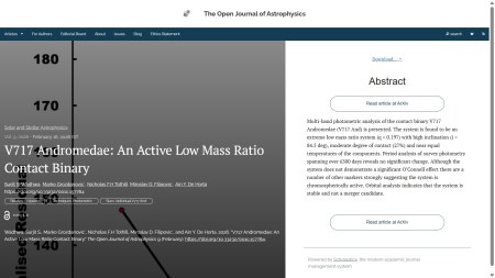 New Publication at the Open Journal of Astrophysics: "V717 Andromedae: An Active Low Mass Ratio Contact Binary" by Surjit S. Wadhwa (Western Sydney U. Australia), Marko Grozdanovic (Astronomical Observatory Belgrade, Serbia), and Nicholas F.H Tothill, Miroslav D. Filipovic, Ain Y. De Horta (Western Sydney U.)