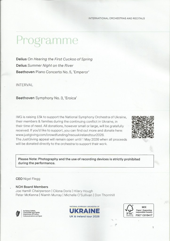 It’s not often that I go to the National Concert Hall in Dublin on a Monday evening, but I made an exception last night to attend a concert by the National Symphony Orchestra of Ukraine (who are currently on tour and have recently played a number of concerts in the UK). It was an interesting (and very full programme) and a very enjoyable concert. Partly because of the large Ukrainian diaspora in Ireland, hall was packed last night.