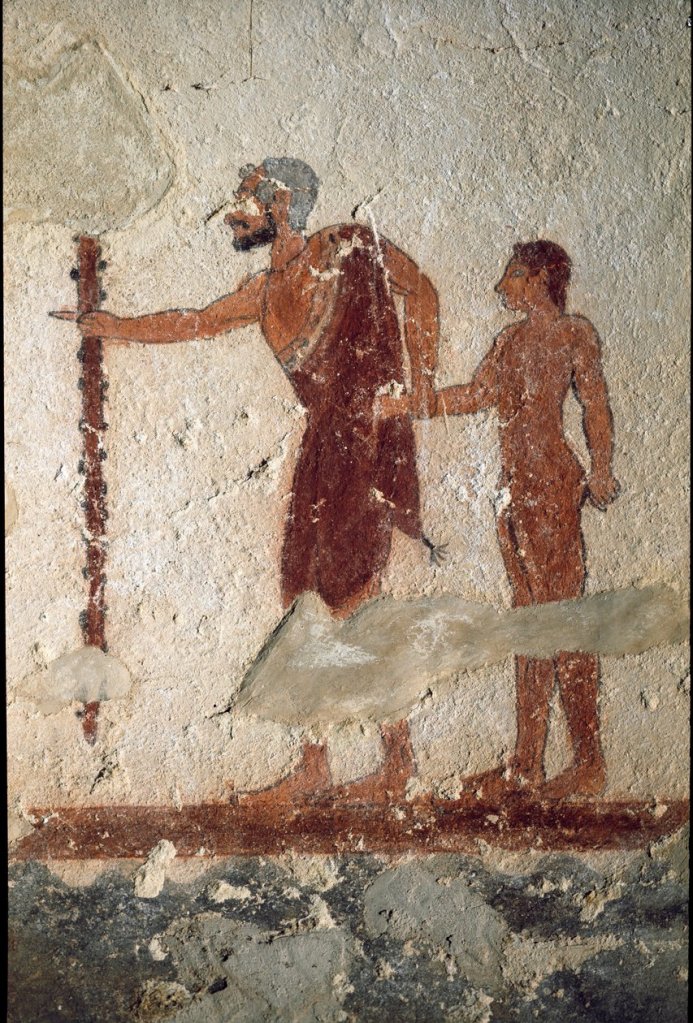 Elderly man supported by boy, fresco of the Tomb of the Jugglers, Necropolis of Tarquinia (Unesco World Heritage List, 2004), Lazio, Italy, Etruscan civilization, 6th century BC.