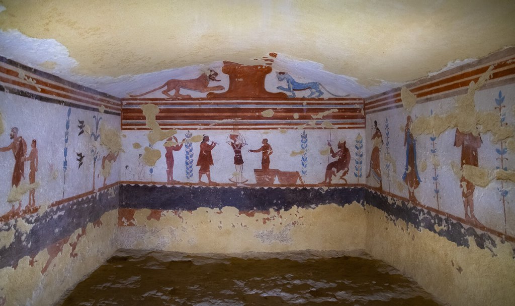 This is from the Etruscan (i.e. pre-Roman) period and the best guess for the date is around 530 BC, so the first thing of interest is that, although it is damaged, it has survived pretty well. Fresco (paint on wet plaster, left to dry) is a very fragile medium and many made 1,000 years after this have not lasted as well. The reason for this is that the tomb was not unearthed until 1961, so it was undisturbed for about 2,500 years. The piece above is a section from a larger work that depicts a sort of funerary ritual.