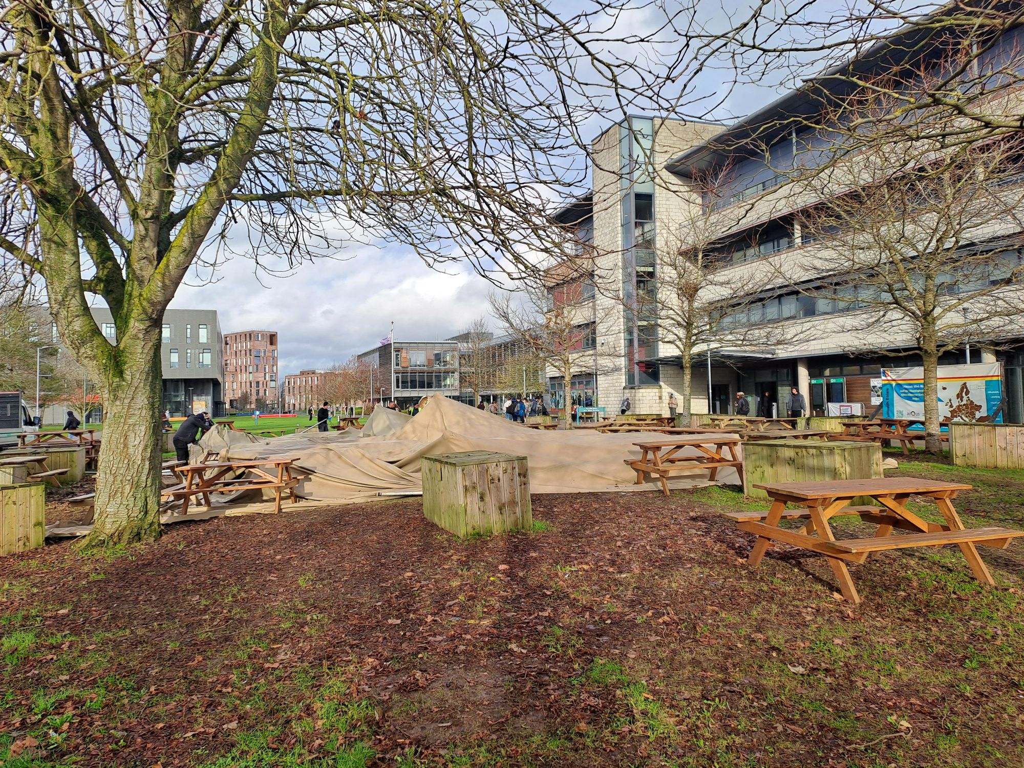 Heavy rain fell overnight, especially in the South. It’s clearer now and the winds are starting to pick up. Although Maynooth is relatively sheltered we’re still expecting gusts up to 100 km/h. As a precaution, the large tent which is usually situated outside the John Hume building has been dismantled to stop it blowing away.