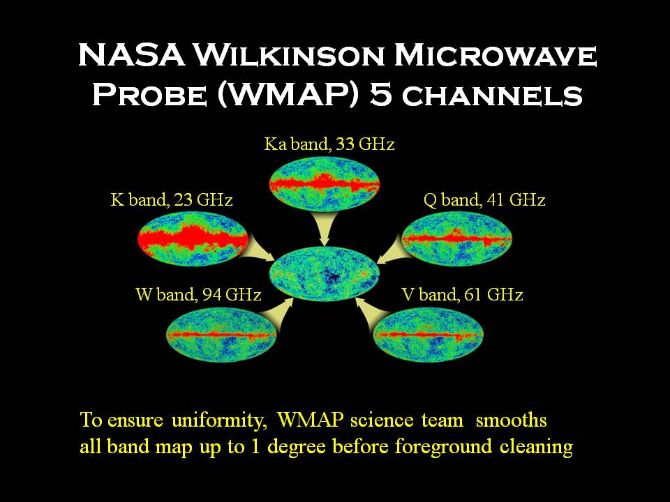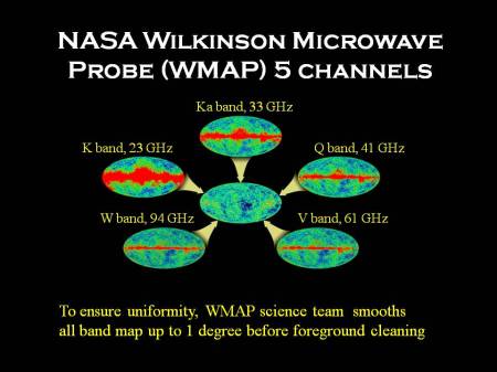 The position of the so-called “acoustic peak” plays an important role in determining the overall curvature of space-time on cosmological scales and the higher-order peaks pin down other parameters. However, it must be remembered that WMAP doesn’t just observe the cosmic microwave background. The signal it receives is heavily polluted by contamination from within our Galaxy and there is also significant instrumental noise. To deal with this problem, the WMAP team exploit the five different frequency channels with which the probe is equipped, as shown in the picture below.