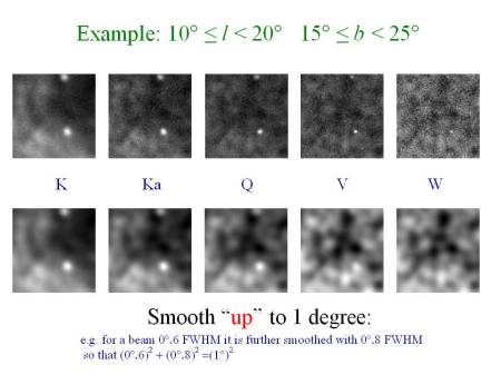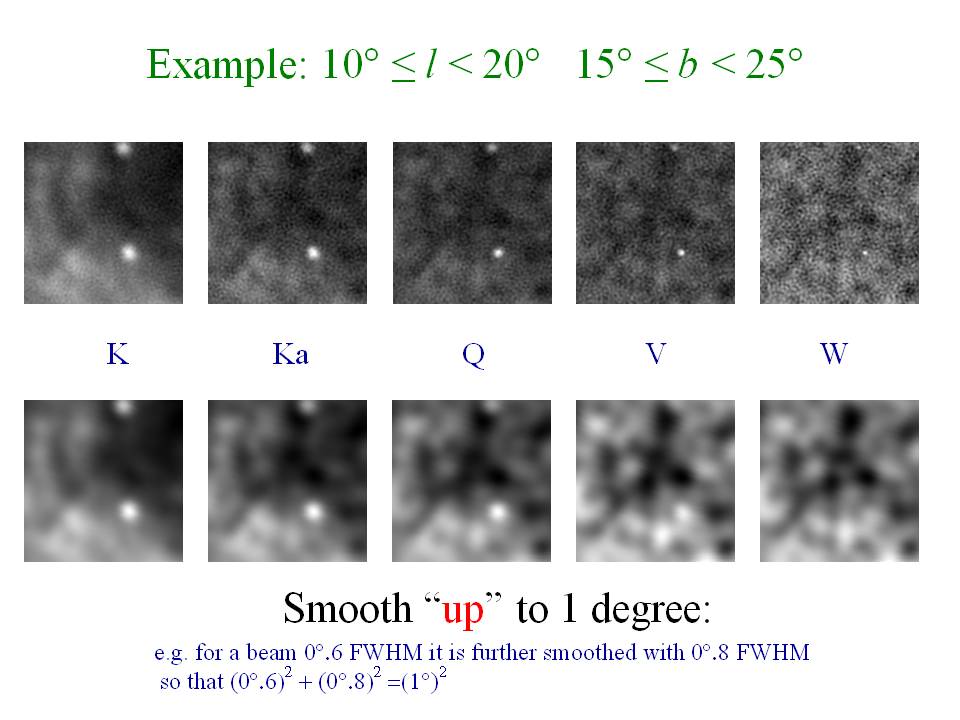 At each frequency the sky is blurred out by the “beam” of the WMAP optical system; the blurring is worse at low frequencies than at high frequencies. In order to do the foreground subtraction, the WMAP team therefore smooth all the frequency maps to have the same resolution, i.e. so the net effect of optical resolution and artificial smoothing produces the same overall blurring (actually 1 degree). This requires accurate knowledge of the precise form of the beam response of the experiment to do it accurately. A rough example (for illustration only) is given in the caption above.
