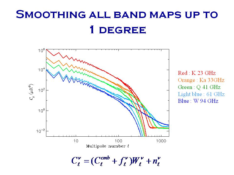 Note this is Cl not l(l+1)Cl as in the first plot of the spectrum. Now you see how much foreground there is in the data: the curves would lie on top of each other if the signal were pure CMB, i.e. if it did not vary with frequency. The equation at the bottom basically just says that the overall spectrum is a smoothed version of the CMB plus the foregrounds plus noise. Note, crucially, that the smoothing suppresses the interesting high-l wiggles.