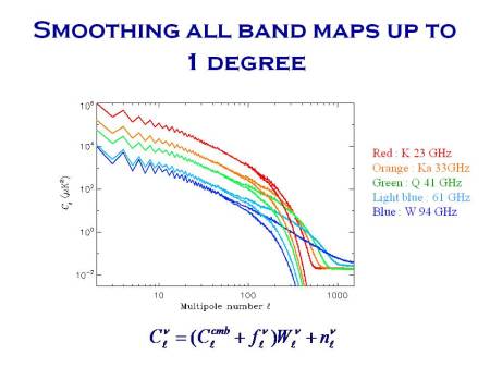 I haven’t got space-time enough to go into how the foreground subtraction is carried out, but once it is done it is necessary to “unblur” the maps in order to see the structure at small angular scales, i.e. at large spherical harmonic numbers l. The initial process of convolving the sky pattern with a filter corresponds to multiplying the power-spectrum with a “window function” that decreases sharply at high l, so to deconvolve the spectrum one essentially has to divide by this window function to reinstate the power removed at high harmonics.
