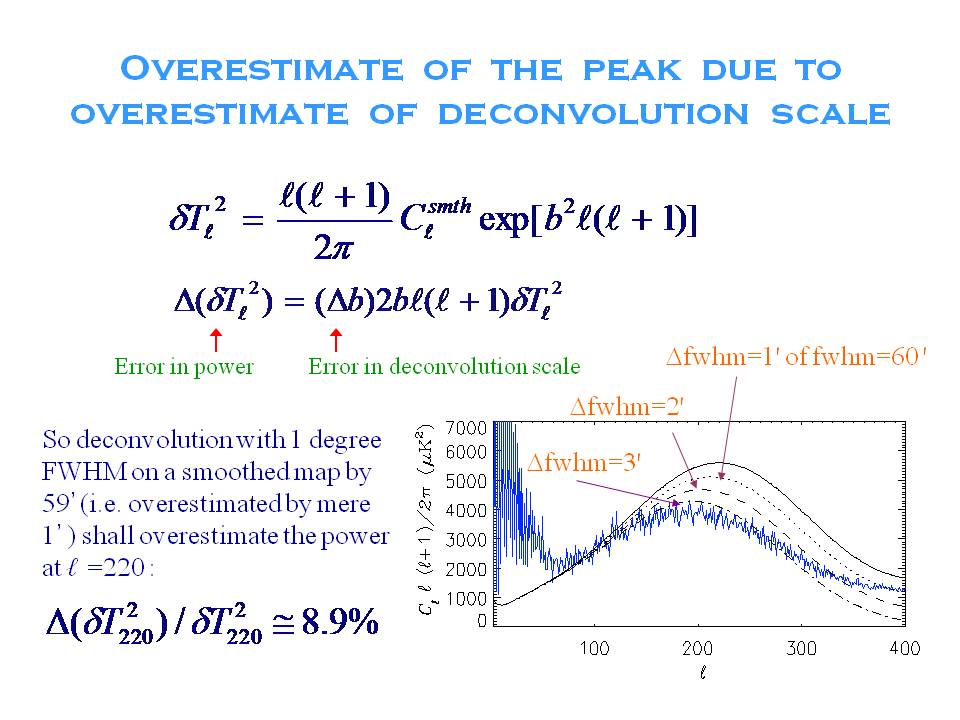 This is where it all gets very tricky. The smoothing applied is very close to the scale of the acoustic peaks so you have to do it very carefully to avoid introducing artificial structure in Cl or obliterating structure that you want to see. Moreover, a small error in the beam gets blown up in the deconvolution so one can go badly wrong in recovering the final spectrum. In other words, you need to know the beam very well to have any chance of getting close to the right answer!