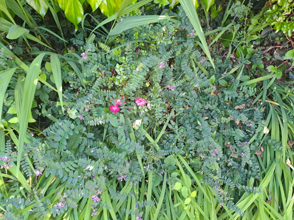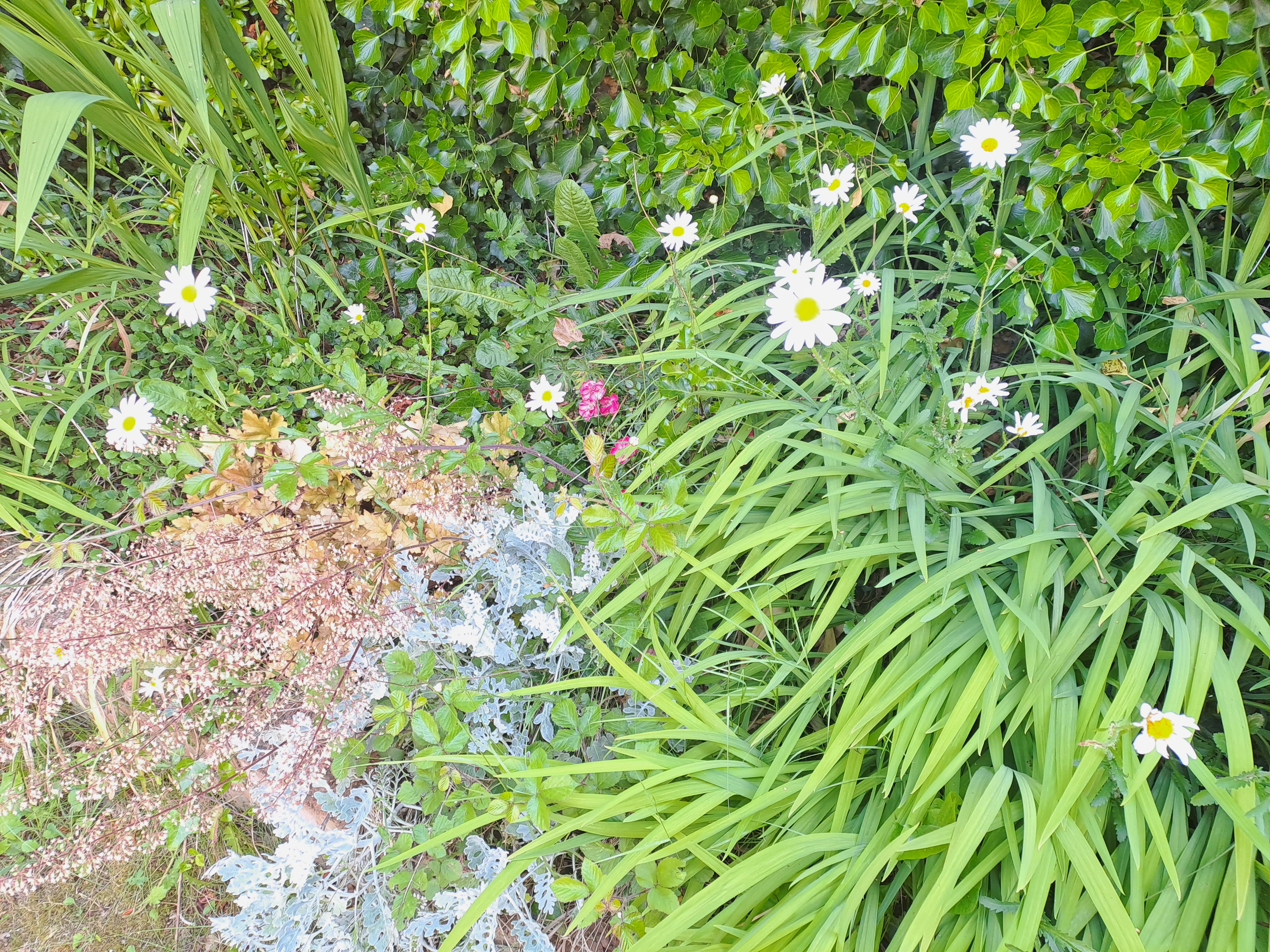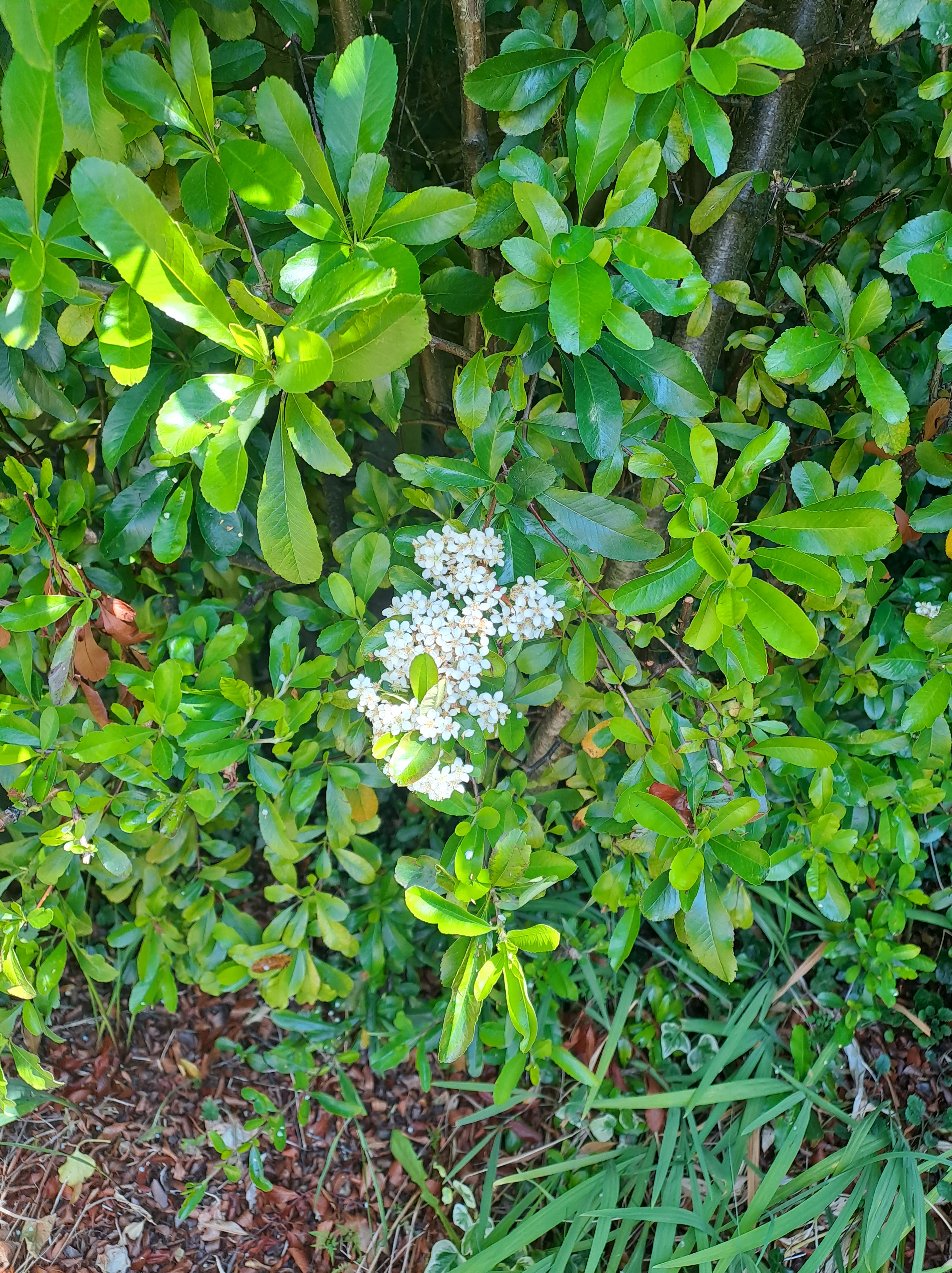 The Scarlet Firethorn – so called because it produces bright red berries – is growing like wildfire as well as flowering profusely. The flowers are nice, but I think past their peak so when they’re done I’ll take some remedial action. The other plants are basically wild flowers, which I like having in the garden as they tend to be rather robust. The long green leaves in the first two pictures are Montbretia, which produced bright red flowers later in the summer, and which is grown from bulbs.