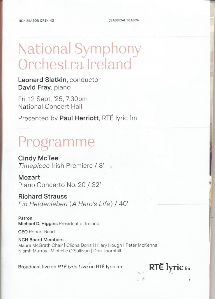 Posted in Music with tags David Fray, Ein Heldenleben, Leonard Slatkin, Mozart Piano Concerto No. 20, music, National Concert Hall, National Symphony Orchestra Ireland, Richard Strauss, Wolfgang Amadeus Mozart on September 13, 2025 by telescoper