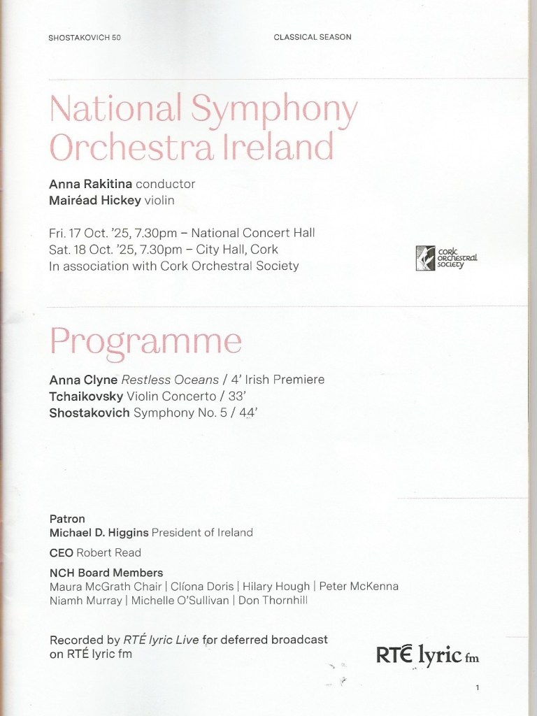 Posted in Biographical, Music with tags Anna Clyne, Anna Rikitina, Dmitri Shostakovich, Mairéad Hickey, National Symphony Orchestra Ireland, Pyotr Ilyich Tchaikovsky, Restless Oceans, Shostakovich Symphony No. 5, Tchaikovsky Violin Concerto on October 18, 2025 by telescoper