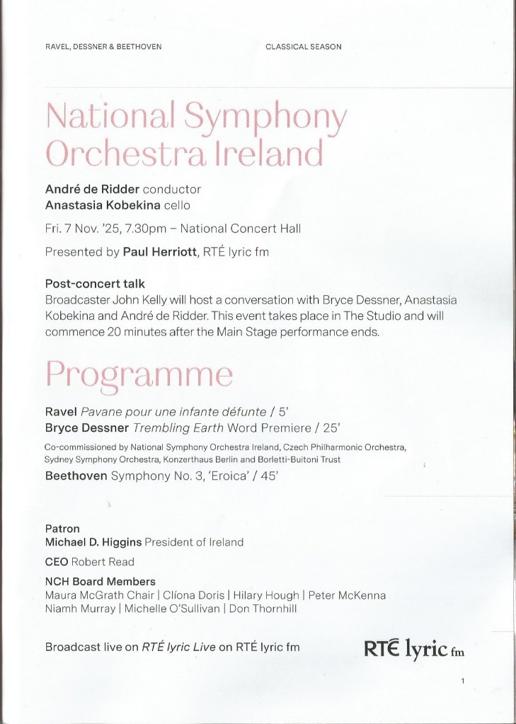 Posted in Music with tags Anastasia Kobekina, Beethoven Symphony No. 3, Bryce Dessner, Eroica Symphony, Ludwig van Beethoven, Maurice Ravel, National Concert Hall, National Symphony Orchestra Ireland, Pavane pour une infante défunte, Trembling Earth on November 8, 2025 by telescoper