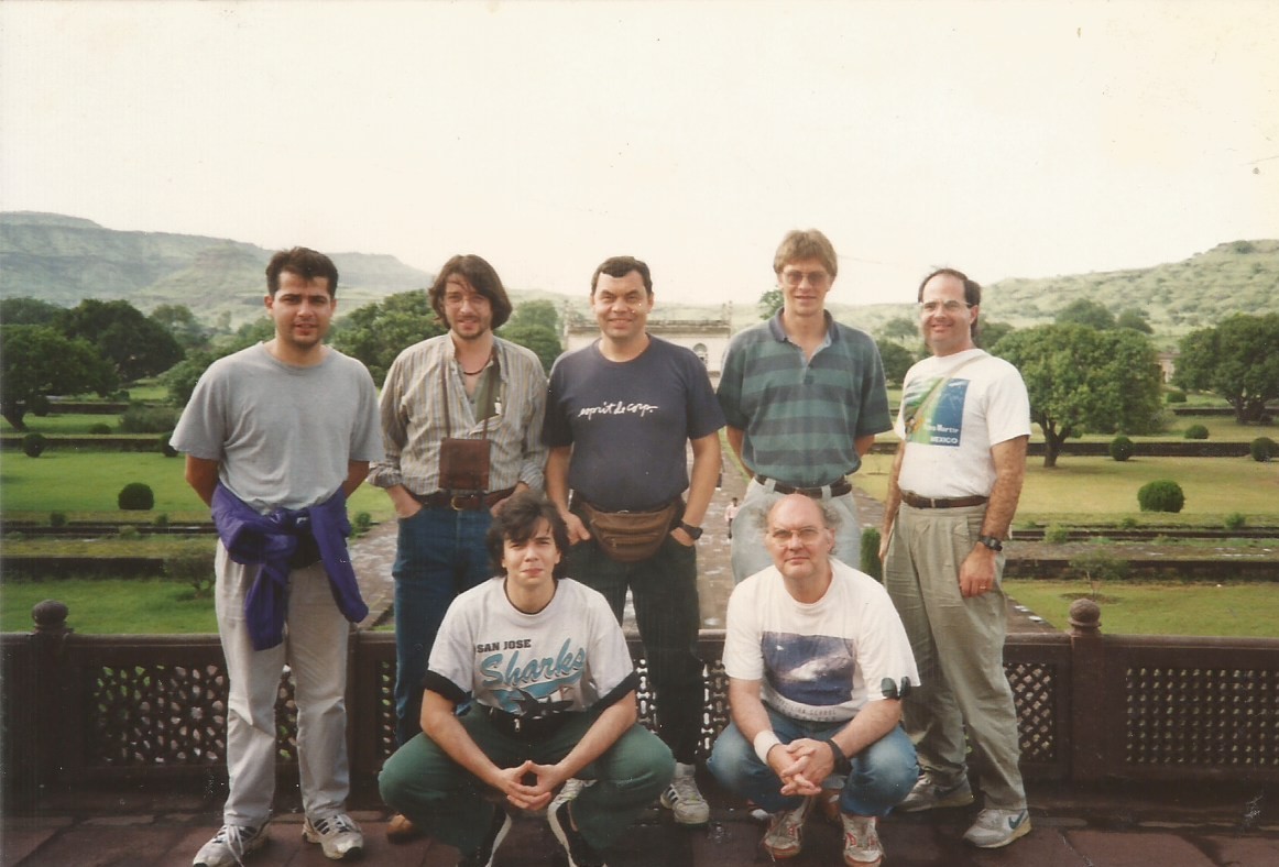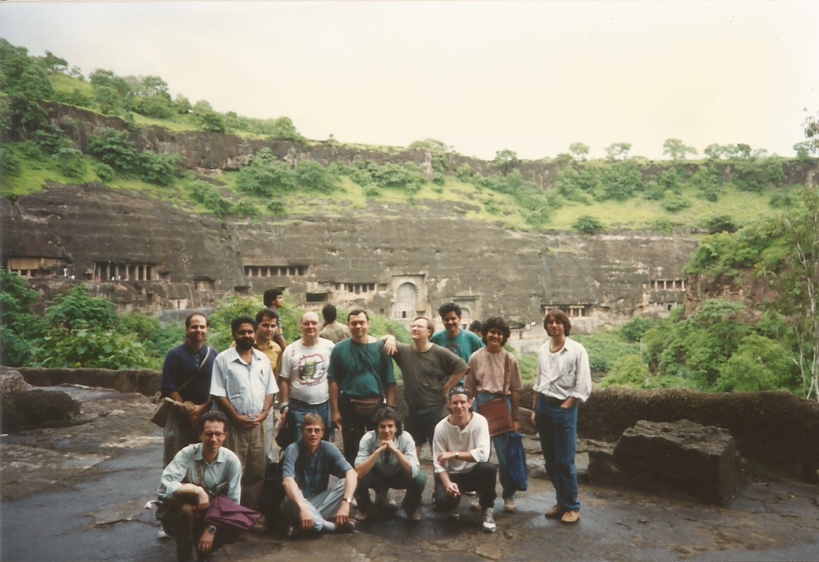 The picture on the left shows: (standing, L to R) Francis Bernardeau, Paolo Catelan, Sergei, ?*, Paul R. Shapiro; (crouching) Enzo Branchini and Bernard Jones. The picture on the right has the addition of, among others, Varun Sahni (between Paul Shapiro and Bernard Jones), Dick Bond (with his arm on Sergei’s shoulder) and Sabino Matarrese (front left); I’m on the right of the front row. I remember these pictures were taken on an excursion from Pune to see the historic caves and temples at Ajanta and Ellora.