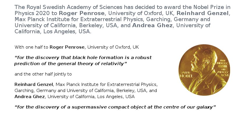 You will no doubt recall the announcement a few weeks ago of the award of the 2020 Nobel Prize for Physics to Roger Penrose, Andrea Ghez and Reinhard Genzel.