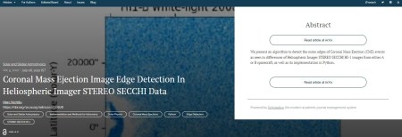 The latest publication is entitled “Coronal Mass Ejection Image Edge Detection In Heliospheric Imager STEREO SECCHI Data” and is written by Marc Nichitiu of the Stony Brook School (NY, USA). If you want to know more about the Solar observatory STEREO you can look here. SECCHI stands for “Sun-Earth Connection Coronal and Heliospheric Investigation”, which is a camera array on the STEREO spacecraft.