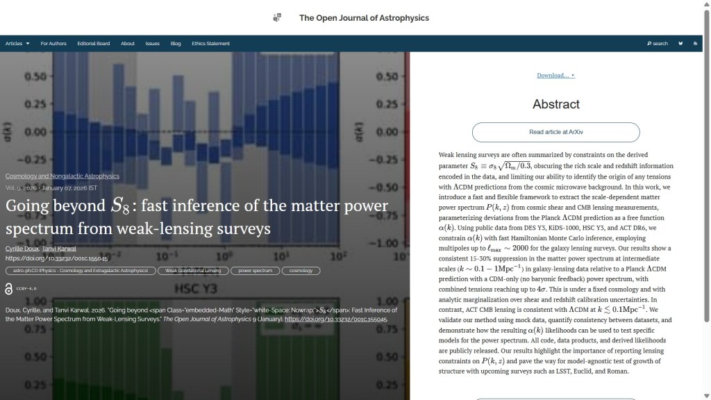 The second paper is “Going beyond S8: fast inference of the matter power spectrum from weak-lensing surveys” by Cyrille Doux (Université Grenoble Alpes, France) and Tanvi Karwal (U. Chicago, USA). This was published on Wednesday January 7th in the folder Cosmology and Nongalactic Astrophysics and it presents a new framework to extract the scale-dependent matter power spectrum from cosmic shear and CMB lensing measurements, revealing a consistent suppression in the matter power spectrum in galaxy-lensing. The overlay is here: