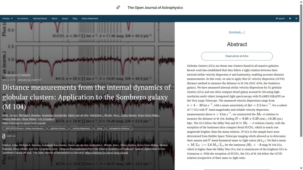 Finally for this week we have “Distance measurements from the internal dynamics of globular clusters: Application to the Sombrero galaxy (M 104)” by Katja Fahrion (University of Vienna, Austria) and 9 others based in Spain, Australia, UK, USA, Brazil, Germany and Switzerland. This was published on Friday 9th January (yesterday) in the folder Astrophysics of Galaxies. This study uses the globular cluster velocity dispersion method to measure the distance to the Sombrero galaxy, finding it to be approximately 9.0 Mpc away. The overlay is here: