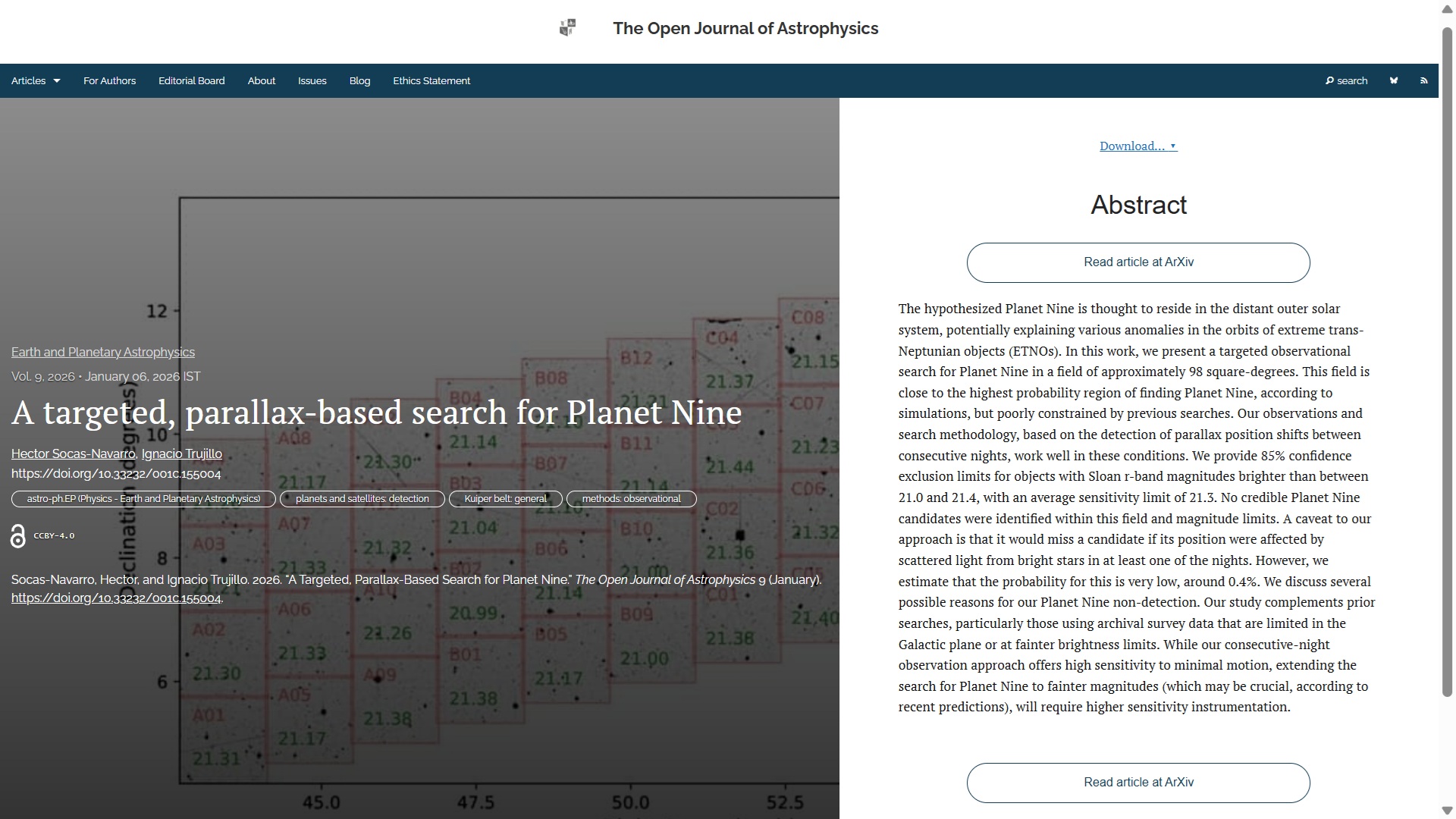 The first paper this week (and of course the first of 2026) is “A targeted, parallax-based search for Planet Nine” by Hector Socas-Navarro and Ignacio Trujillo (both of the Instituto de Astrofísica de Canaria, Spain). This article describes a targeted search for the hypothesized Planet Nine in the outer solar system, using parallax position shifts. No credible candidates were found within the observed field. It was published on Tuesday January 6th in the folder Earth and Planetary Astrophysics. The overlay is here: