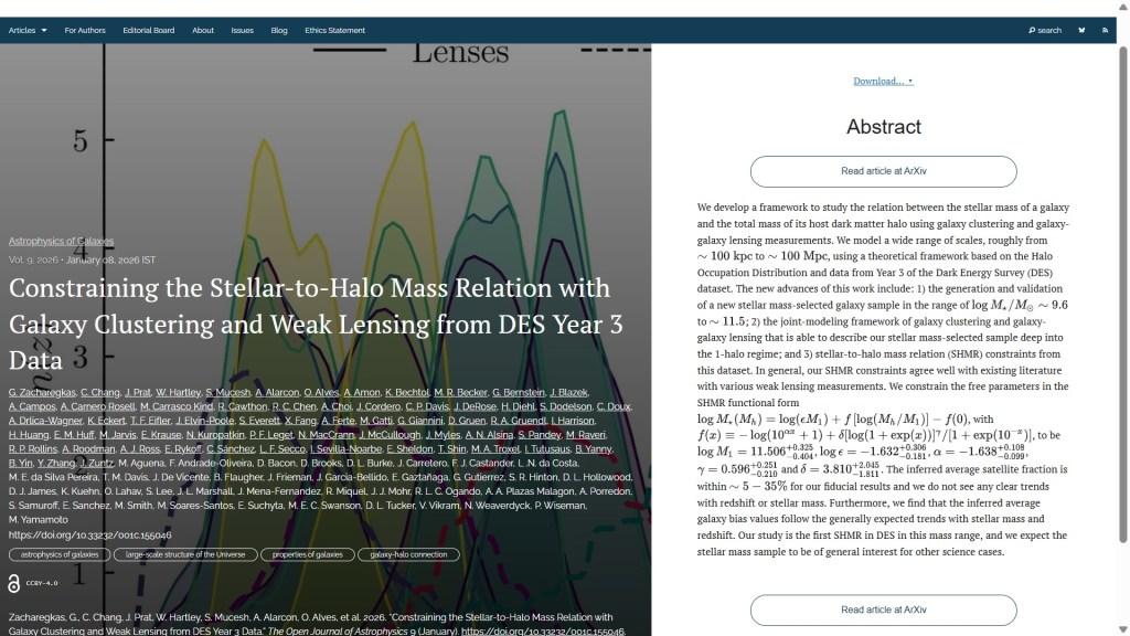 Next we have “Constraining the Stellar-to-Halo Mass Relation with Galaxy Clustering and Weak Lensing from DES Year 3 Data” which is led by G. Zacharegkas et al. (Argonne National Laboratory, USA) and has 102 other authors too numerous to list by name from many institutions around the world again too numerous to list by name. It presents a framework to analyze the relationship between a galaxy’s stellar mass and its dark matter halo mass, using data from the Dark Energy Survey. The findings align with previous results. This paper was published on Thursday January 8th in the folder Astrophysics of Galaxies. The overlay is here: