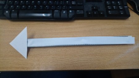 This sophisticated yet lightweight tool utilizes a pressure-sensitive adhesive (`blu tack’) to attach shapes cut from a flexible sheet of a substance derived from cellulose pulp (`paper’) to a rigid plastic geometric measuring device (`ruler’) in order to represent the magnitude and direction of a vector. Illustrated here is the version designed for use with a chalkboard; an alternative version in black is available for use with a whiteboard. The head can be detached in order to separate the concept of magnitude from that of direction.