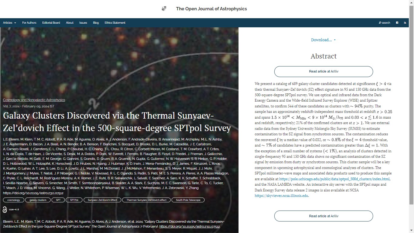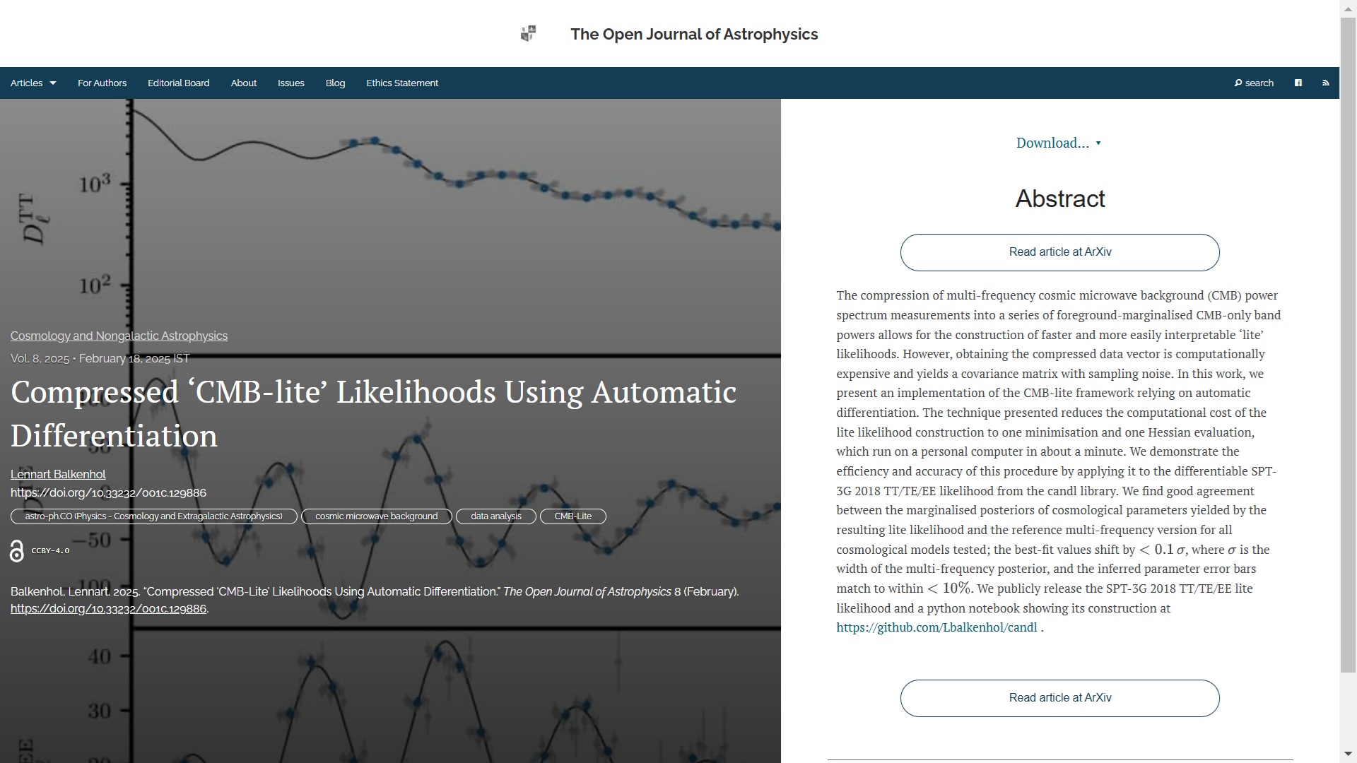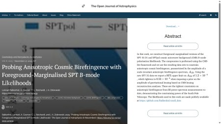 The first paper to report this week is “Probing Anisotropic Cosmic Birefringence with Foreground-Marginalised SPT B-mode Likelihoods” by Lennart Balkenhol (Sorbonne Université, France), A. Coerver (UC Berkeley, USA), C. L. Reichardt (U. Melbourne, Australia) and J. A. Zebrowski (U. Chicago, USA). This paper was published on Monday November 17th in the folder Cosmology and Nongalactic Astrophysics. It presents a way of using data from the Souh Pole Telescope (SPT) in the CMB-lite framework to constrain the level of cosmic birefringence. The overlay is here: