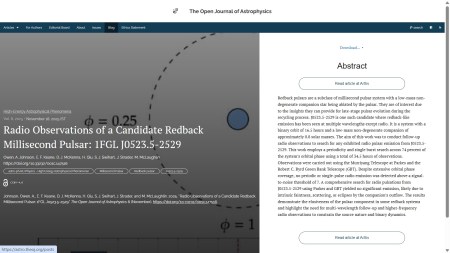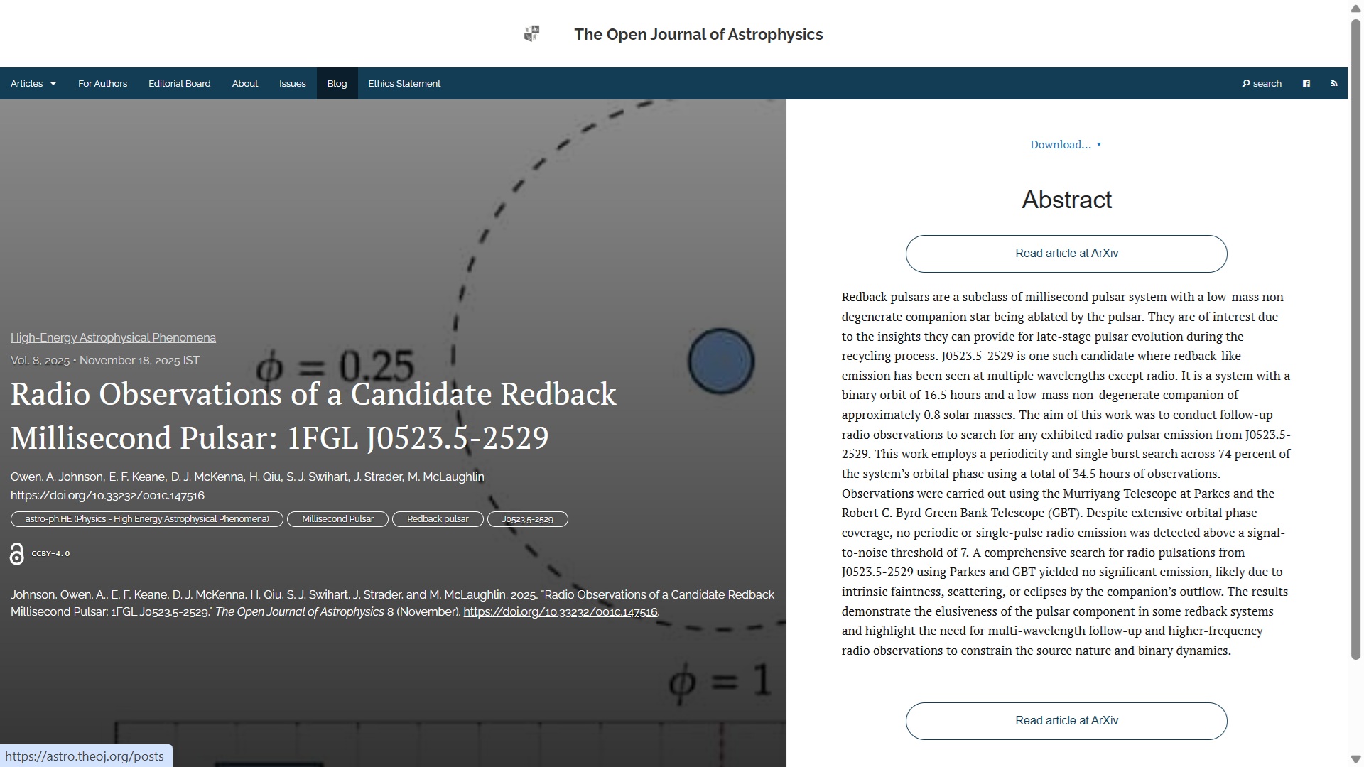 The second paper of the week is “Radio Observations of a Candidate Redback Millisecond Pulsar: 1FGL J0523.5-2529” by Owen. A. Johnson & E. F. Keane (Trinity College Dublin, Ireland), D. J. McKenna (ASTRON, NL), H. Qiu (SKAO, UK), S. J. Swihart (Insitute for Defense Analyses, USA), J. Strader (Michigan State U., USA) and M. McLaughlin (West Virginia U., USA). This one was published on Tuesday November 18th 2025 in the folder marked High-Energy Astrophysical Phenomena and it describes a search for radio emission from a candidate “redback pulsar” J0523.5-2529 resulting in upper limits but no detection.