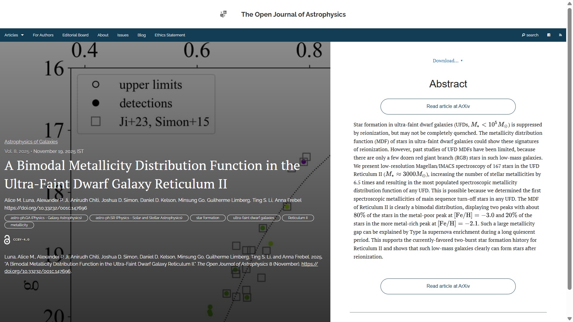 The fourth paper of the week is “A Bimodal Metallicity Distribution Function in the Ultra-Faint Dwarf Galaxy Reticulum II” by Alice M. Luna (U. Chicago, USA) and 8 others based in the USA, Korea and Canada. This was published on Wednesday November 19th in the folder Astrophysics of Galaxies. It decribes low-resolution Magellan/IMACS spectroscopy of 167 stars in the ultra-faint galaxy Reticulum II, revealing a clearly bimodal distribution.