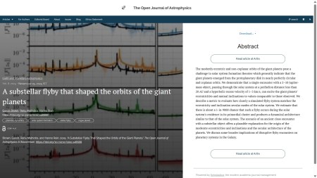 The second paper of the week is “A substellar flyby that shaped the orbits of the giant planets” by Garett Brown (U. Toronto at Scarborough, Canada), Renu Malhotra (U. Arizona, USA) and Hanno Rein (U. Toronto at Scarborough, Canada). This article was published on Wednesday 5th November 2025, also in the folder Earth and Planetary Astrophysics. It argues that an ancient close encounter with a substellar object offers a plausible explanation for the origin of the moderate eccentricities and inclinations of the giant planets.