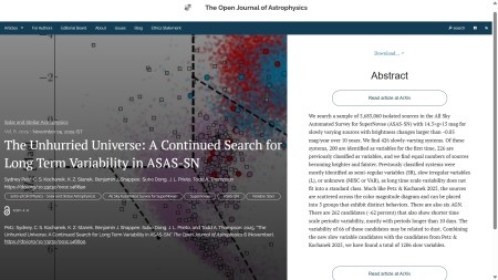 The fourth paper to report is “The Unhurried Universe: A Continued Search for Long Term Variability in ASAS-SN” by Sydney Petz, C. S. Kochanek & K. Z. Stanek (Ohio State U., USA), Benjamin J. Shappee (U. Hawaii, USA), Subo Dong (Peking University, China), J. L. Prieto (Universidad Diego Portales, Chile) and Todd A. Thompson (Ohio State U., USA). This one was also published on Wednesday November 5th 2025, but in the folder Solar and Stellar Astrophysics. It describes the discovery and investigation of slowly-varying sources in the All Sky Automated Survey for SuperNovae (ASAS-AN) leading to the identification of 200 new variable stars. The overlay is here: