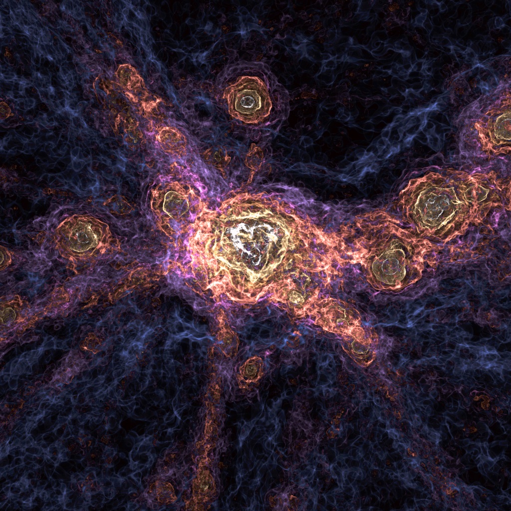 The most massive galaxy cluster in the flagship, 2.8 Gpc, FLAMINGO volume, with each side of the image spanning 40 megaparsecs. Each colour represents a different gas density contour, highlighting the extremely complex spatial and velocity structure of the gas within the cluster. At the center, the gas serendipitously aligns to produce a love heart.