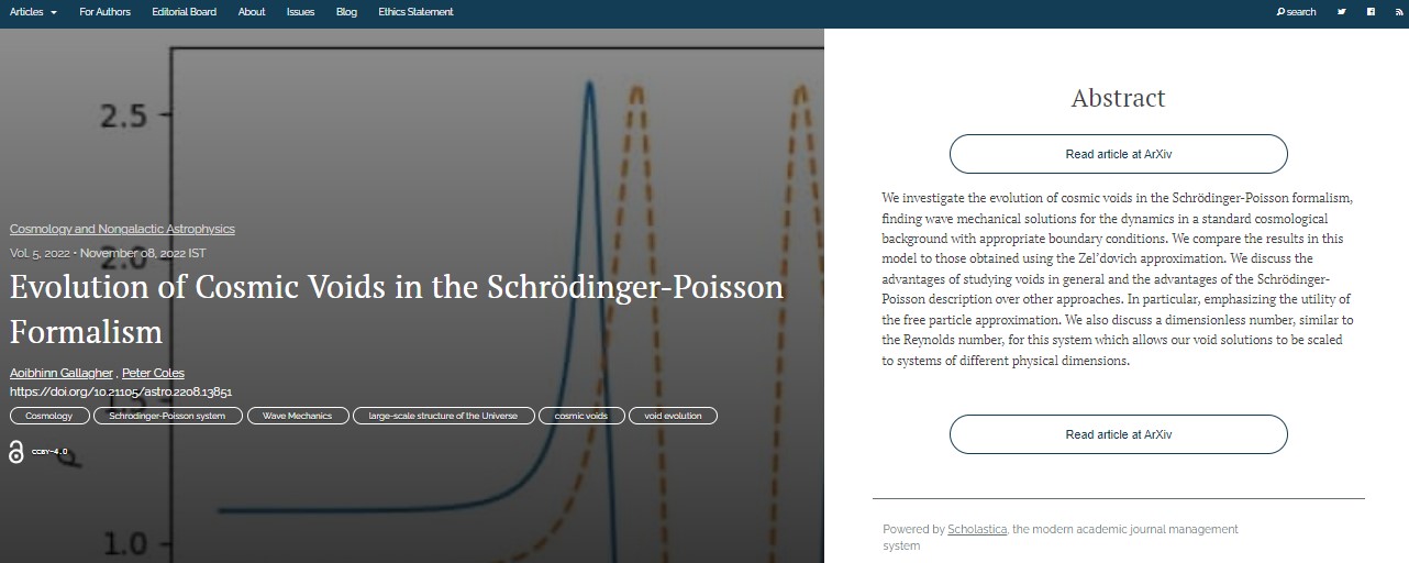 The latest publication is entitled “Evolution of Cosmic Voids in the Schrödinger-Poisson Formalism” and the authors are Aoibhinn Gallagher and Peter Coles (Who he? Ed) both of the Department of Theoretical Physics at Maynooth University. Obviously as author I played no role in the selection of referees or any other aspect of the editorial process.