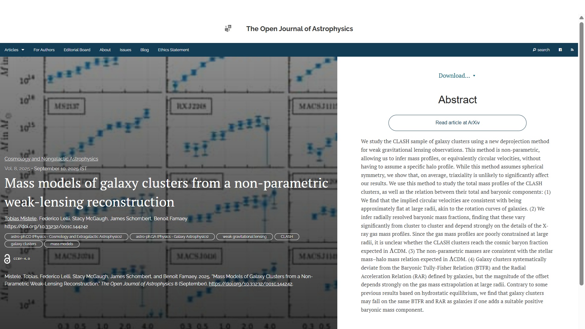 The fourth paper of this week was also published on Wednesday 10th September. It is “Mass models of galaxy clusters from a non-parametric weak-lensing reconstruction” by Tobias Mistele (Case Western Reserve U., USA), Federico Lelli (INAF, Firenze, Italy), Stacy McGaugh (Case Western), James Schombert (U. Oregon, USA) and Benoit Famaey (Université de Strasbourg, France). Published in the folder Cosmology and NonGalactic Astrophysics, it presents new, non-parametric deprojection method for weak gravitational lensing applied to a sample of galaxy clusters. The overlay is here: