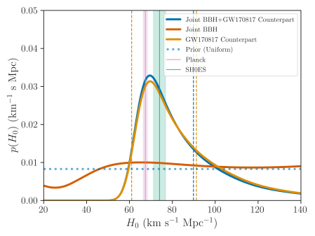 In this paper, Bernard points out that a binary coalescence — such as the merger of two neutron stars — is a self calibrating `standard candle’, which means that it is possible to infer directly the distance without using the cosmic distance ladder. The key insight is that the rate at which the binary’s frequency changes is directly related to the amplitude of the gravitational waves it produces, i.e. how `loud’ the GW signal is. Just as the observed brightness of a star depends on both its intrinsic luminosity and how far away it is, the strength of the gravitational waves received at LIGO depends on both the intrinsic loudness of the source and how far away it is. By observing the waves with detectors like LIGO and Virgo, we can determine both the intrinsic loudness of the gravitational waves as well as their loudness at the Earth. This allows us to directly determine distance to the source.